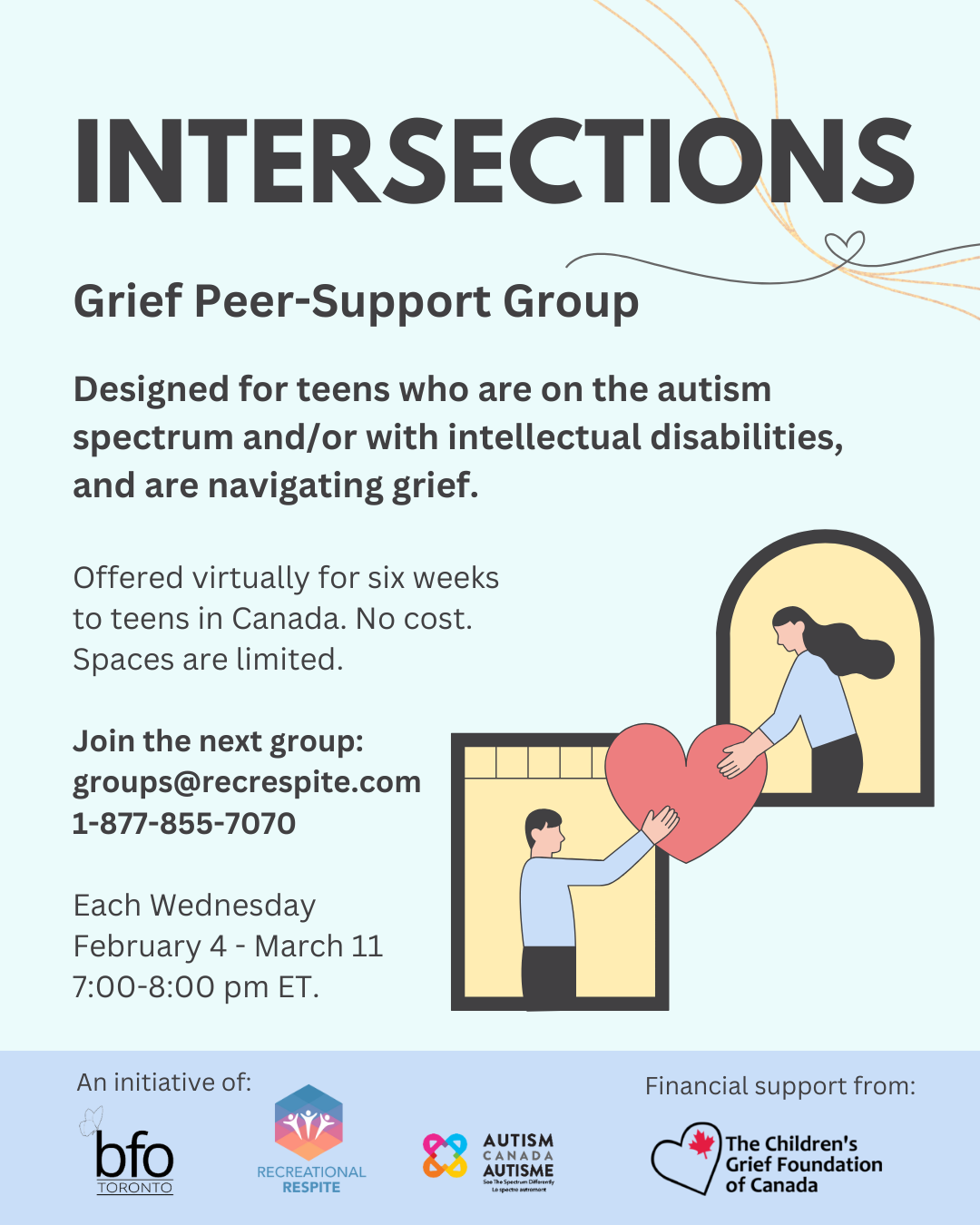 Intersections is a guided peer-support group developed for teens on the autism spectrum and/or with intellectual disabilities who are navigating grief due the death or dying of a loved one. Through Intersections is a guided peer-support group developed for teens on the autism spectrum and/or with intellectual disabilities who are navigating grief due the death or dying of a loved one. Through six online programs, participants will find a safe, inclusive space to creatively express grief, develop coping strategies, and build community. Free. Canadian residents, ages 13-18. Spaces are limited. Next group: Wednesdays February 4 - March 11, from 7-8pm ET More information: www.recrespite.com/intersections-grief-support-group/ Register now: https://wkf.ms/3Dpt2pA / 1-877-855-7070 / groups@recrespite.com This initiative was prepared by Recreational Respite in partnership with the BFO-Toronto and AUTISM CANADA. While financially supported by The Children's Grief Foundation of Canada of Canada, Recreational Respite Inc is solely responsible for all content.